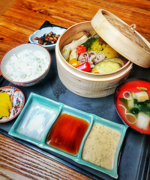 伊賀とよさ豚と季節野菜の蒸籠蒸し+ご飯+味噌汁+小鉢+漬物+ミニデザート